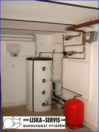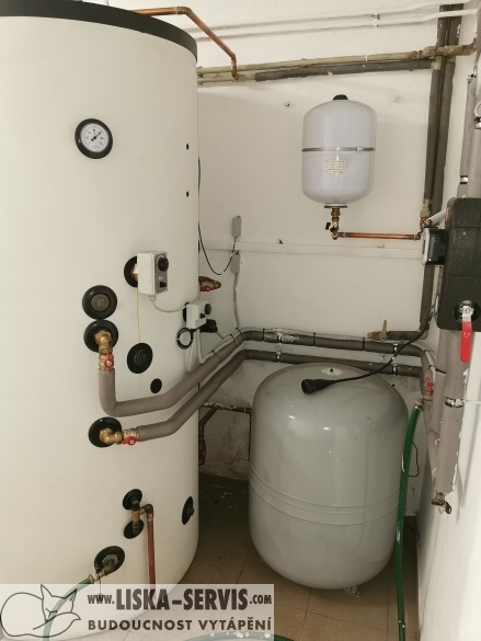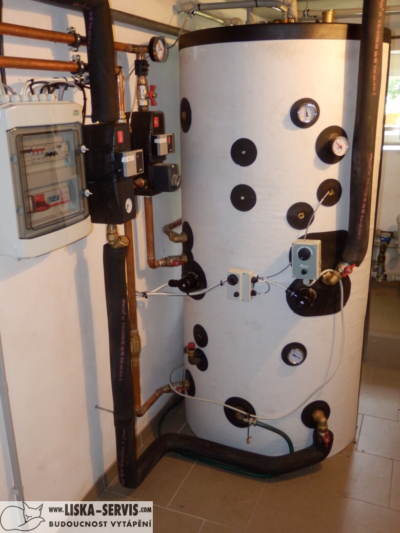 tepelné čerpadlo CTC ECOAIR 415 zajišťuje vytápění rodinného domu prostřednictvím radiátorů + ohřev vody v Akumulační nádobě DUO 390/130 KP s vnořeným zásobníkem teplé vody