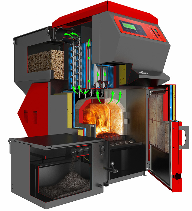 s účinností 92,7% na spalování zemědělských produktů, alternativních pelet, dřevních pelet.