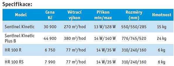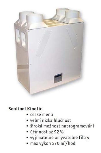 Sentinel Kinetic je moderní centrální rekuperační jednotka určená zejména pro větrání rodinných domů. Její ovládání umožňuje libovolné nastavení intenzity větrání pro jakýkoli interval a jakýkoli den v týdnu, takže je možné jednotku naprogramovat přesně podle potřeby. Ovládací jednotka je v češtině, proto je její nastavení velmi jednoduché. Větrací jednotka se instaluje na stěnu. Ovládací panel je zabudován v čelní straně větrací jednotky. Jednotka má v sobě integrován bypass (obtok) pro letní období. Klapka bypassu je elektronicky ovládána na základě vnitřní teploty v objektu. Filtry v jednotce jsou velmi jednoduše vyměnitelné. Ovládací jednotka umožňuje napojení externích ovládacích prvků jako například čidlo vlhkosti nebo čidlo kvality vzduchu nebo je možné například zvýšit výkon jednotky rozsvícením světla třeba na WC. Velkou výhodou této jednotky je malá prostorová náročnost a velmi nízká hlučnost.