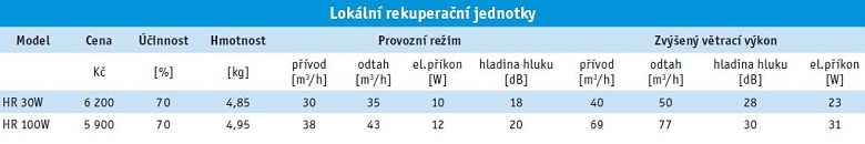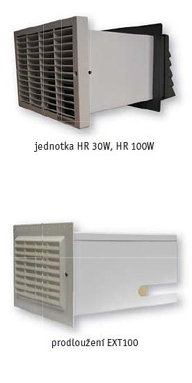 Tento typ rekuperačních jednotek je určen do jednotlivých místností obytných objektů. Jednotky mají možnost dvou větracích výkonů. Provozní výkon pro nutné provětrání místnosti v době nepřítomnosti osob a zvýšený výkon pro intenzivnější provětrání místnosti v době většího využití místnosti. Přepínání mezi provozním a zvýšeným výkonem je možné pomocí ručního přepínače nebo automaticky hygrostatem v závislosti na nastaveném stupni relativní vlhkosti vzduchu snímané v prostoru. Tyto jednotky pracují s vyrovnanou tlakovou bilancí, do místnosti přivádějí téměř stejné množství čerstvého vzduchu jaké odvádějí. Nemůže proto docházet k nasávání pachů z ostatních místností. Obě jednotky je možné standardně instalovat do stěny o tloušťce maximálně 280 mm, v případě větší tloušťky stěny je nutné použít prodloužení EXT 100. Jednotka HR 30W je určena k větrání zejména obytných místností jako jsou pracovny, obývací pokoje, obytné kuchyně a pod. Jednu jednotku HR 30W je možné použít k větrání místnosti o maximální ploše 40 m2.Touto jednotkou je také možné větrat koupelny nebo WC. Jednotka HR 30W je vybavena jemným polyuretanovým filtrem třídy filtrace EU2, který zachytává prach. Je vhodná i do dětských pokojů. Jednotka HR 100W je určena k větrání větších obytných místností jako jsou jídelní haly, velké obytné kuchyně, společenské místnosti apod. Jednotkou HR 100W je také možné větrat menší salonky restauračních zařízení. V jednotce není instalovaný žádný filtr. V případě zájmu je možné dokoupit k jednotce filtr třídy EU2. Prodloužení EXT 100 je určeno pro instalaci jednotek HR 30W a HR 100W do stěn tloušťky 280 mm až 500 mm.