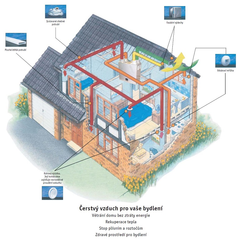 V současné době je většina novostaveb vzduchotěsná. Při rekonstrukcích dochází také k utěsňování většiny spár a průduchů, aby nedocházelo k nežádoucím únikům tepla. Tím se však zabraňuje přirozené výměně vzduchu v místnostech. Ve spojení s tím však vzniká v místnostech nedostatek čerstvého vzduchu, hromadí se zde nepříjemné pachy a může docházet ke vzniku plísní. Proto je třeba zajistit nutnou výměnu vzduchu tak, abychom minimalizovali tepelné ztráty větráním. Toto je možné pouze použitím ventilačních jednotek s rekuperací tepla, tzv. rekuperačních jednotek. Jednotka má v sobě zabudován rekuperační výměník, ve kterém odevzdá teplý znehodnocený vzduch většinu svého tepla čerstvému přiváděnému vzduchu. Teplý vzduch tak není bez užitku odveden otevřeným oknem ven. Nabízíme Vám dva základní typy ventilačních rekuperačních jednotek. Centrální jednotky s vyšším výkonem, od kterých je pomocí potrubí rozváděn vzduch do jednotlivých místností. Druhým typem jsou lokální jednotky, které se umisťují do stěny a zajišťují výměnu vzduchu pouze pro místnost, ve které jsou umístěny. Centrální jednotka zajistí rovnoměrnou výměnu vzduchu v celém objektu. Jednotka pomocí potrubí přivádí čerstvý vzduch do obytných místností jako je ložnice nebo obývací pokoj a odvádí znečištěný vzduch z namáhaných místností jako je záchod, koupelna či kuchyň.