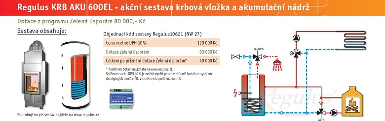 podrobný rozpis materiálu: Akční set Regulus KRB AKU 600EL krbová vložka a akumulační nádrž za 49 000,- Kč včetně DPH 10 % a po odečtení dotace z programu Zelená úsporám. .