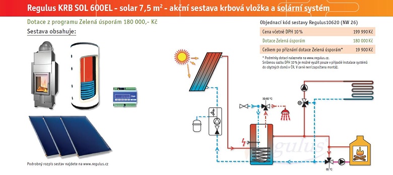 Akční set Regulus KRB SOL 600EL krbová vložka a solární systém za 19 900,- Kč po odečtení dotace včetně DPH 10 %.