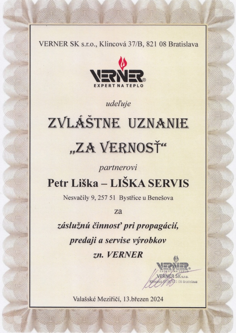 Zvláštní ocenění 2024 „ Za Věrnost“ - za záslužnou činnost při propagaci, prodeji a servisování výrobků Verner